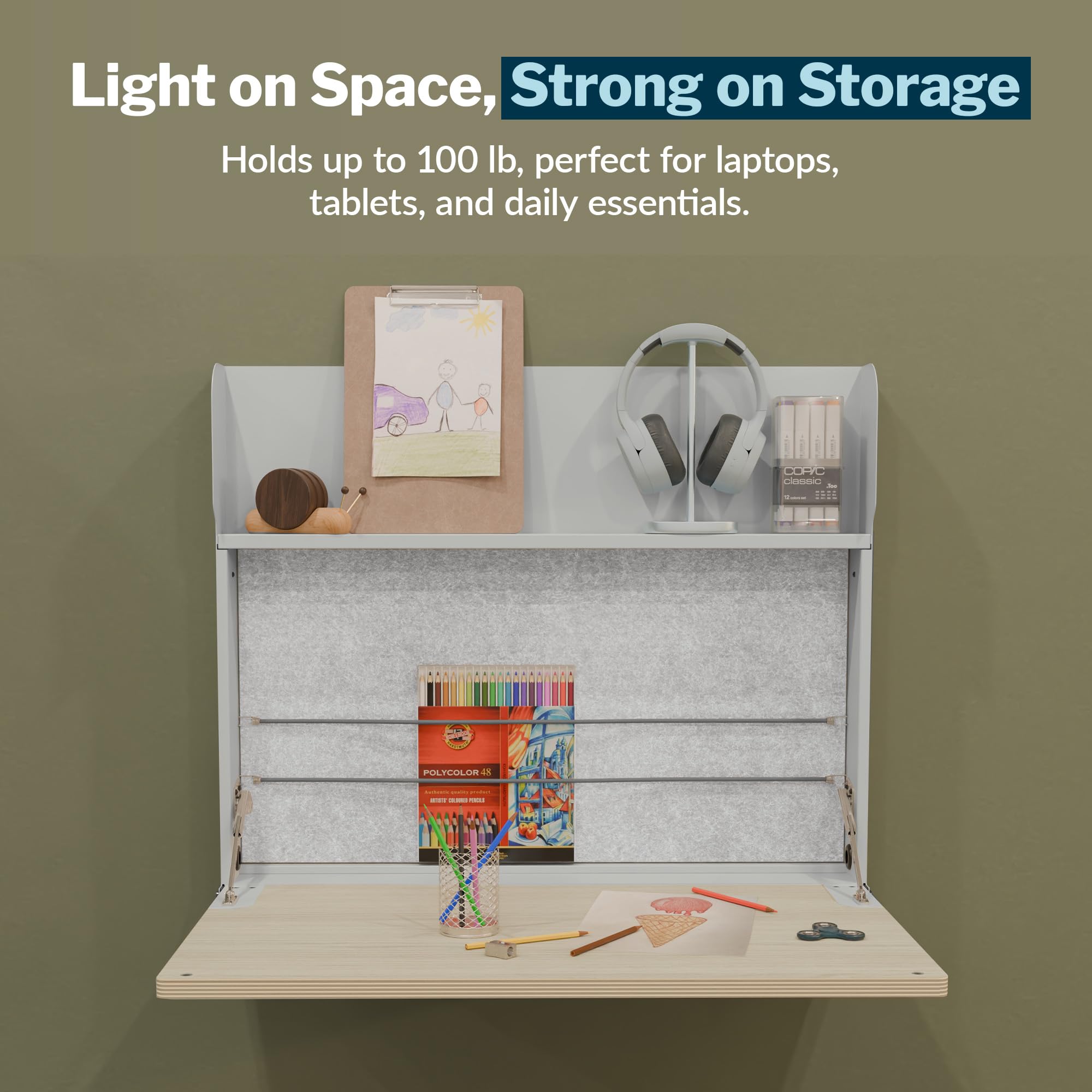 Vari Hide-Away Wall Mounted Floating Desk - 32” Foldable Murphy-Style Desk for Bedroom, Dorm, Apartment + Cable Ports, Bungee Storage, Shelf, 100 Lb Capacity + Simple Assembly (Dove Grey/Light Wood)