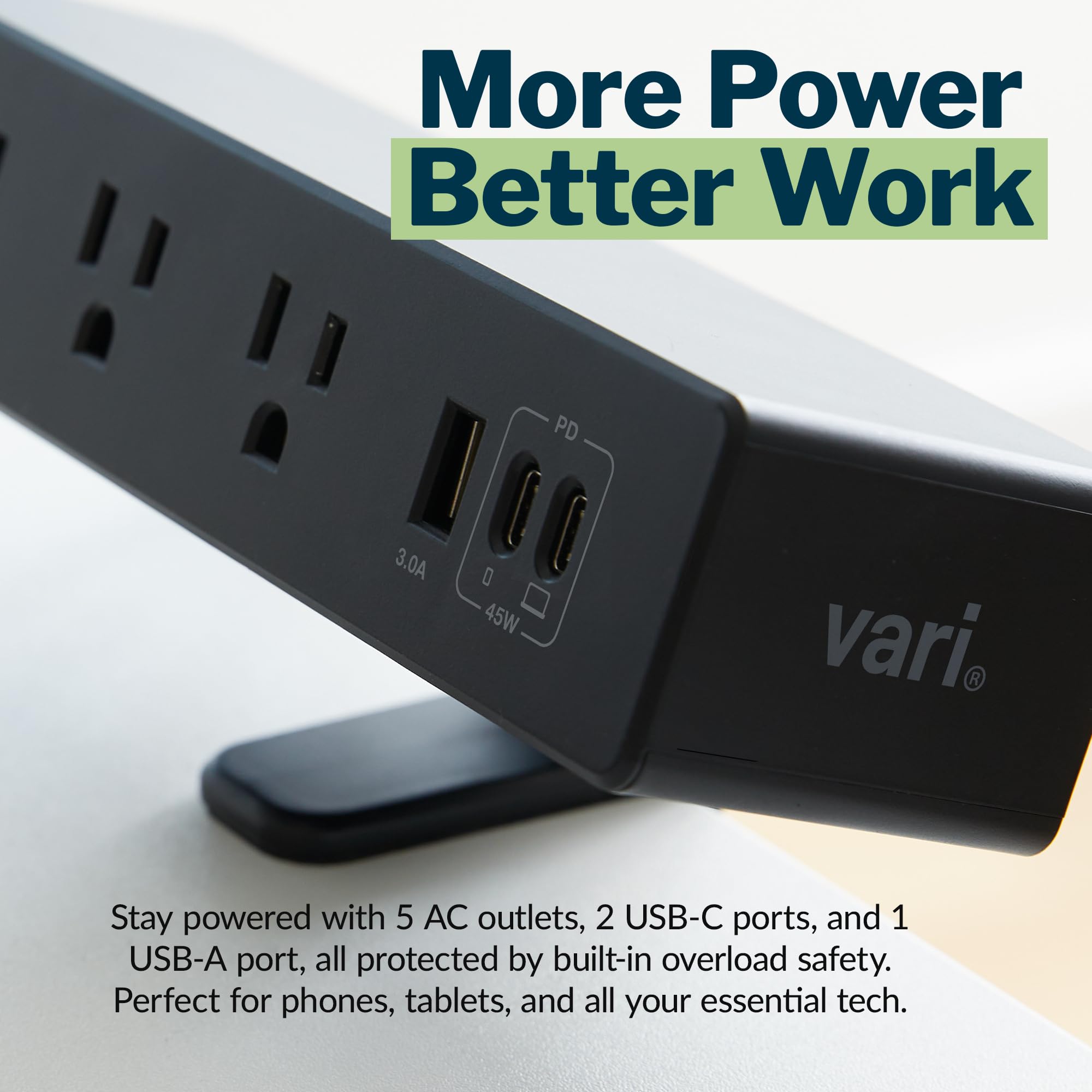 Vari Power Hub 4th Gen – Desk Mount Charging Station with 5 AC Outlets, 2 USB-C Ports, and 1 USB-A Port – Fast 45W Power Delivery, 12’ Cord, Clamp-On Design for Easy Install