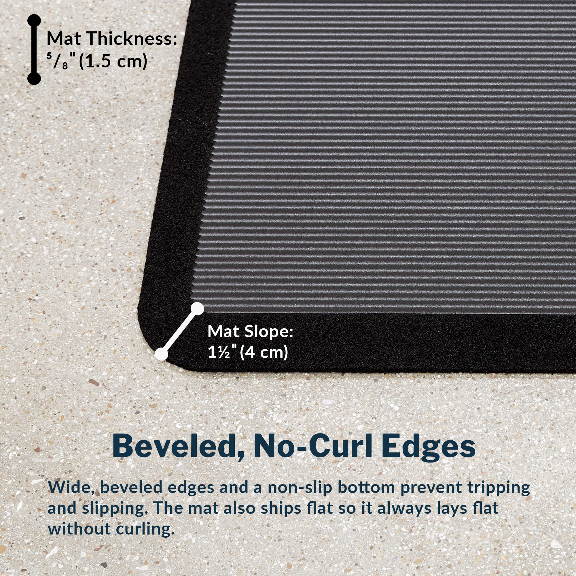 - Safe and Flat Edges - Our mat features wide, beveled, no-curl edges ensuring it always lays flat. Safe for use in the kitchen, home office, or at work, this mat creates a comfortable and active workspace, whether you're cooking or working long hours.